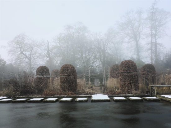 The eye is drawn over a contemporary pool towards serried ranks of domed beech and ghostly trees in the Walled Garden at Broughton Grange designed by Tom Stuart-Smith.