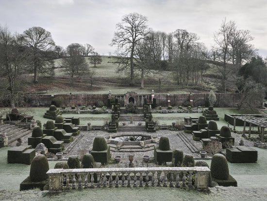 Expertly clipped yew pieces in the gardens of Mapperton House, Dorset, where the early 20th-century topiary garden is laid out along a picturesque valley.