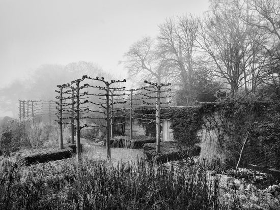 With their curiously-knobbled branches and poker straight trunks, squares of pleached lime trees provide drama in the Walled Garden at Broughton Grange.