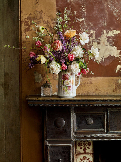 Lilac, Tulips, Fritillary, Poppies, Ranunculus on the mantlepiece in the farmhouse parlour.