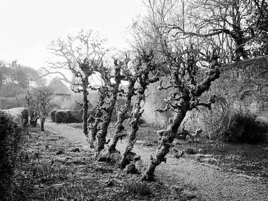 The gnarled forms of 90-year-old apple trees line the main paths in the garden, creating winter structure.